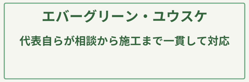 | ポイント | 代表自らによる一貫対応/丁寧なヒアリングと事前見積り/1本からの小規模依頼歓迎/1級造園施工管理技師/2級造園技能士 |