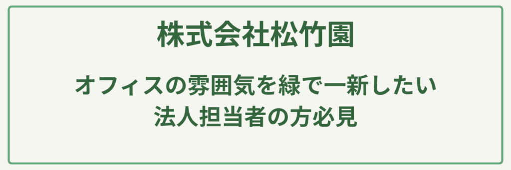 | 対応サービス | 造園設計・施工、観葉植物レンタル(貸し植木)、空間ディスプレイ、植栽管理 |