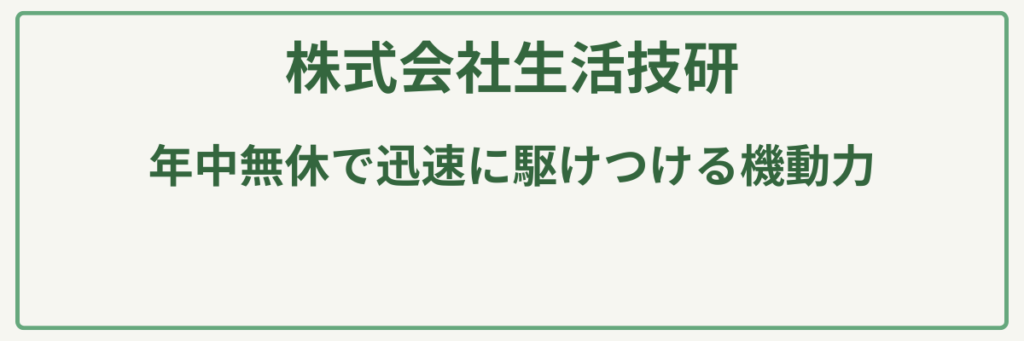 埼玉県上尾市を拠点に、関東全域を幅広くカバーする株式会社生活技研は、お庭のお手入れから不用品回収、害虫駆除まで、暮らしの困りごとをワンストップで解決するプロフェッショナル集団です。植木の剪定や伐採、除草といった造園メンテナンスに加え、特に**「スズメバチなどの害虫駆除」**において高い専門性と豊富な実績を誇ります。