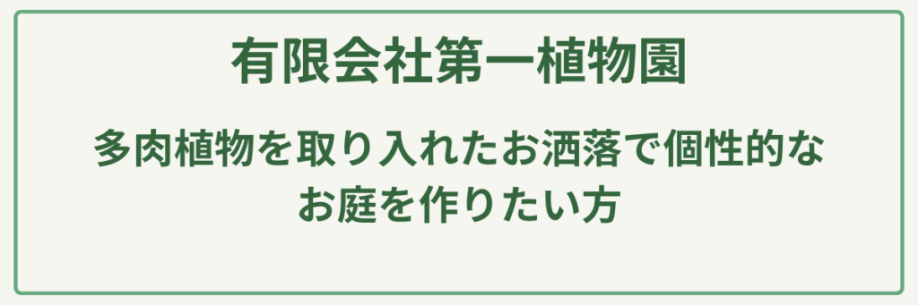 | ポイント | 多肉植物・セダムの生産実績豊富/オリジナルプランター・アート雑貨の自社製作/アンティーク調の空間演出に特化/植木栽培・卸の専門知識/ヨーロッパ風ガーデニング提案/駐車場あり・アクセス良好 |