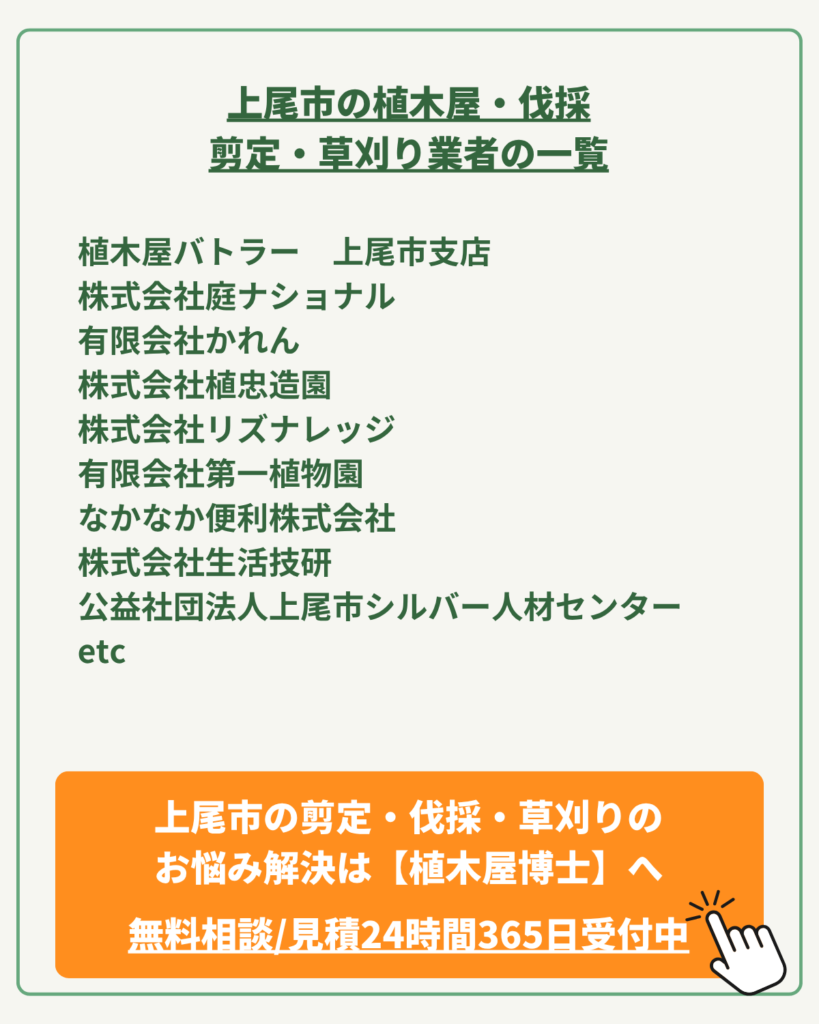 | ポイント | 創業25年以上(平成8年創業)/上尾市・さいたま市密着/植木1本からの小規模依頼歓迎/草取り2時間5,000円〜の明朗会計/見積もり無料/20年以上のキャリアを持つベテラン職人在籍 |