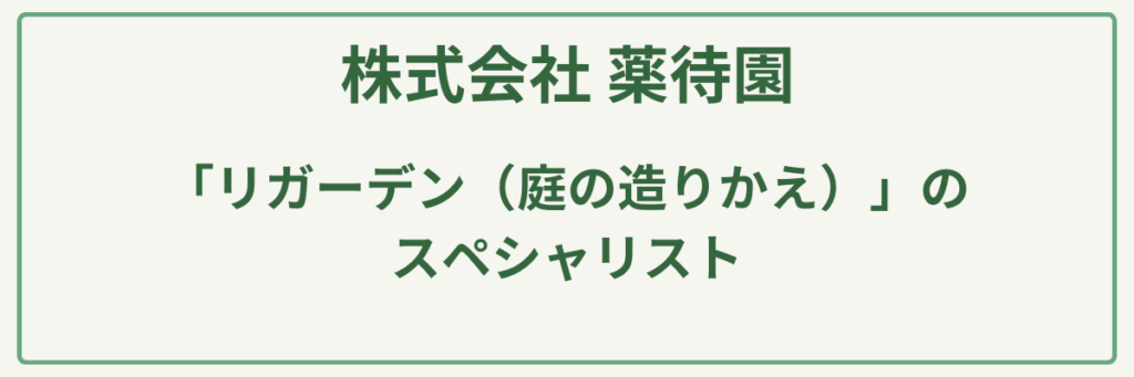 | 対応サービス | リガーデン(庭の造りかえ・リフォーム)、庭園設計・施工、お庭の維持管理(剪定・メンテナンス)、植栽計画 |