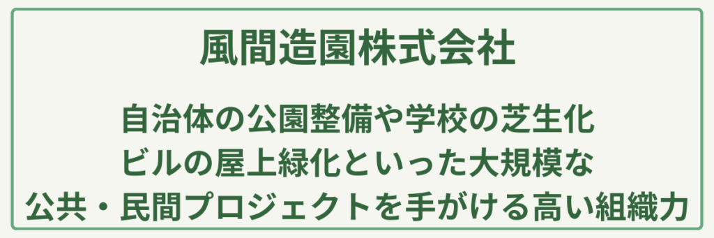 「風間造園株式会社」は、東京都昭島市福島町に本社を構え、都内全域および近隣地域で活動する**「実績と信頼の総合造園企業」です。最大の特長は、自治体の公園整備や学校の芝生化、ビルの屋上緑化といった大規模な公共・民間プロジェクトを手がける高い組織力と技術力**にあります。