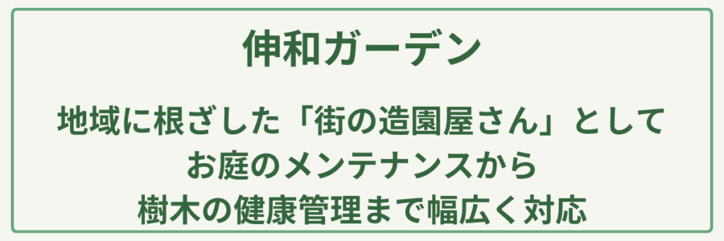 | 対応サービス | 剪定・芝生管理・草刈り・除草・伐採・抜根・緑地管理・害虫駆除・土壌改良 |