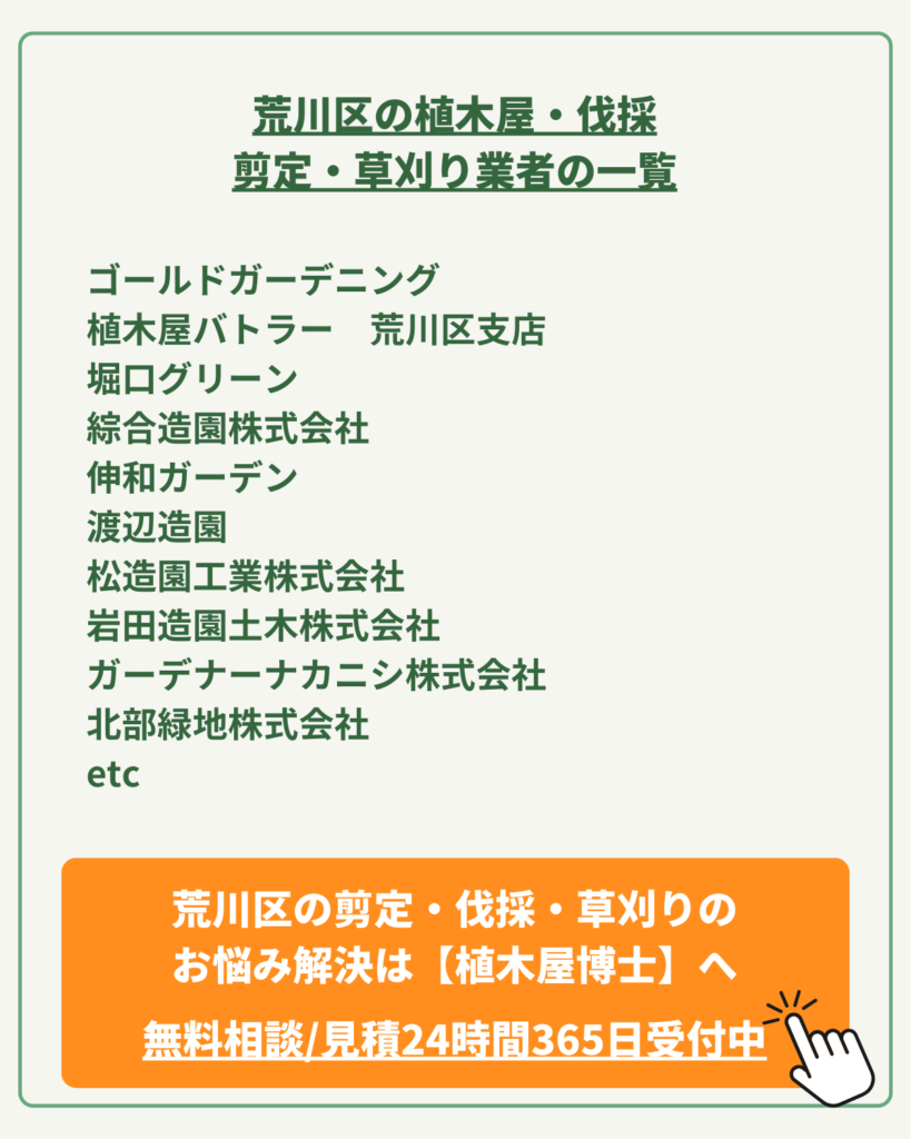 | ポイント | 荒川区を中心とした地域密着のスピード対応/剪定1本3,000円〜の明朗会計/空き家管理・防犯対策の専門プランあり/女性スタッフ在籍による安心施工/現地調査・お見積り完全無料/都内全域および神奈川県の一部までカバー |