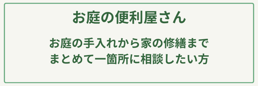 | 対応サービス | 剪定・伐採・伐根・草刈り・芝生管理・人工芝・砂利敷き・不用品回収・外構工事 |
