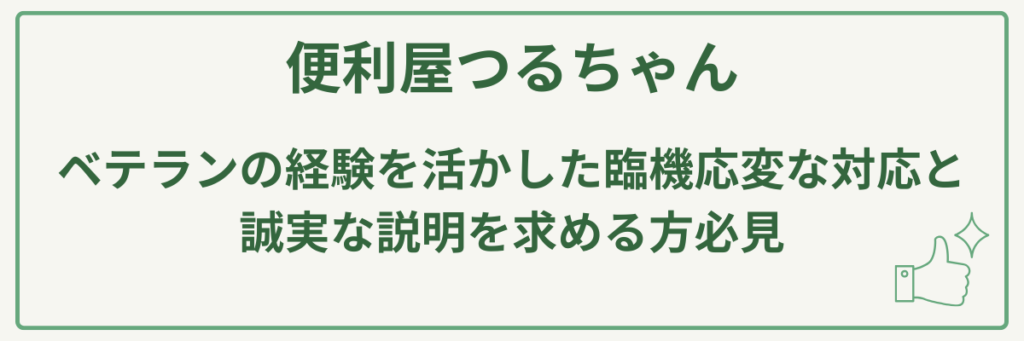 便利屋つるちゃんの強みは、地域密着で10年以上の運営実績と、実務経験15年以上のベテランスタッフによる安心感です。