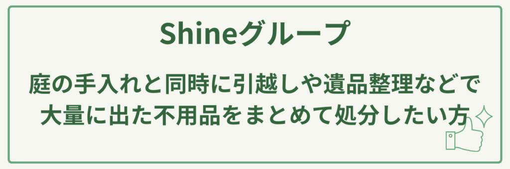 Shineグループの最大の強みは、草刈り・伐採といった屋外作業と、不用品回収・遺品整理・ごみ屋敷片付けといった屋内作業を、リーズナブルな価格設定で一括して承れる総合的な対応力です。