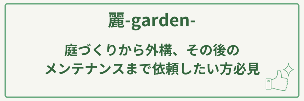 | 対応サービス | 庭づくり(デザイン設計・施工)、外構工事一式、庭の剪定・メンテナンス、樹木・芝生の剪定、駐車場の増設、家庭菜園の提案 |