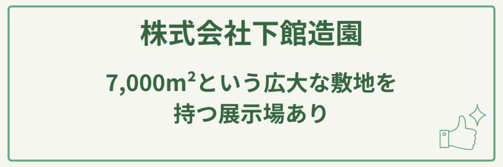 株式会社下館造園の強みは、和風・洋風問わず造園設計・施工からエクステリア・外構工事までトータルで手掛ける高い専門性と、7,000m²という広大な敷地を持つ展示場で、実際の和・洋庭園モデルや豊富な樹木(高木から下草まで)を見て選べることです。