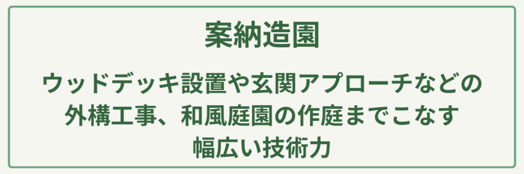| 対応サービス | 剪定・植栽・外構(エクステリア)工事・ウッドデッキ施工・和風庭園・玄関アプローチ |