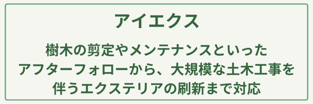 | 対応サービス | 剪定・伐採・除草・造園工事・外構(エクステリア)工事・緑地管理 |
