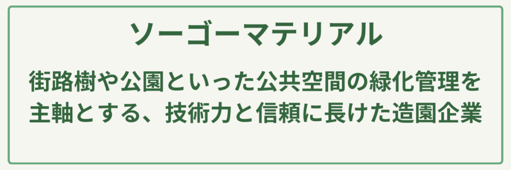 ソーゴーマテリアルは、神奈川県藤沢市を拠点に、街路樹や公園といった公共空間の緑化管理を主軸とする、技術力と信頼に長けた造園企業です。最大の強みは、公共インフラを支える厳しい安全基準をクリアした確かな施工品質と、高木剪定から砂場の砂入れ替えまでこなす幅広い対応力にあります。そのため、**「安全性と仕上がりの美しさを最優先に考え、大規模な管理を確実に任せたいマンション理事会の方」や、「公共工事レベルの高品質な剪定・伐採技術を、自分の大切なお庭や敷地にも取り入れたい方」**に最もおすすめの植木屋です。