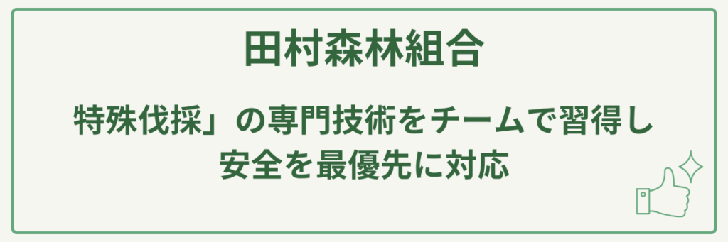 | 対応サービス | 特殊伐採(建築物、架線、道路沿いの木など)、山林伐採、大径木伐採、高い樹木の剪定 |