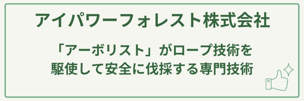 「アイパワーフォレスト株式会社」は、福島県奥会津三島町を拠点とし、建築物や架線、道路沿いなど、クレーン車の侵入や倒木が不可能な場所にある難易度の高い樹木を、熟練の「空師(そらし)」や「アーボリスト」がロープ技術を駆使して安全に伐採する専門技術が強みです。