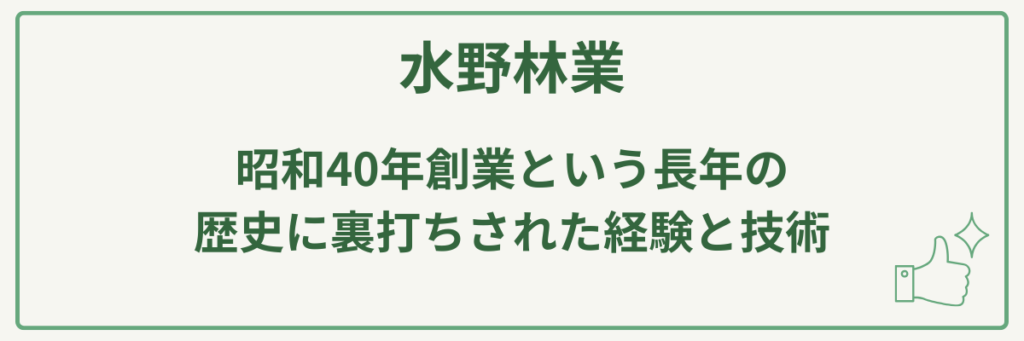 福島県石川郡古殿町に拠点を置く「水野林業」は、昭和40年創業という長年の歴史に裏打ちされた経験と技術で、家屋や電線にかかる支障木や傾斜地にある危険な木の「特殊伐採」から、広大な山林の管理・買取まで、林業全般を一貫して手掛けているのが強みです。