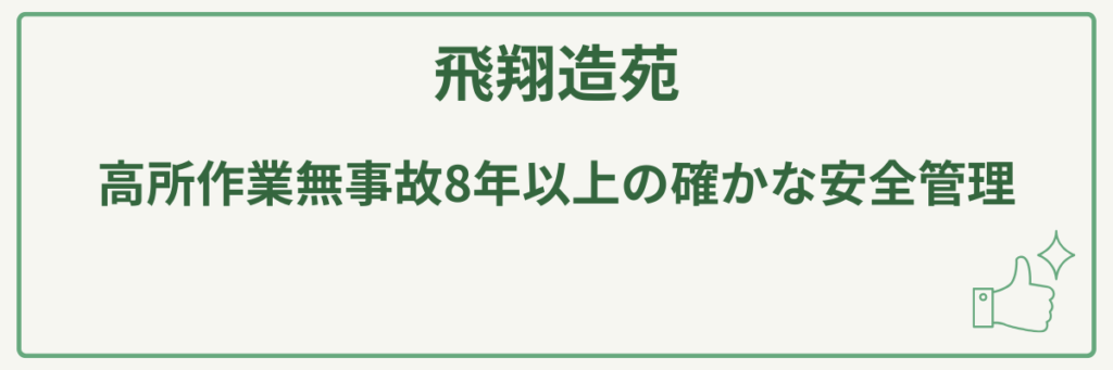 福島県全域及び近隣エリアに対応する「飛翔造苑」は、「空師」と呼ばれるツリークライミング技術を得意とし、高所作業車やクレーン車が入れない狭小地・斜面・崖など、あらゆる難所で高木・巨木を伐採・剪定できる専門技術と、高所作業無事故8年以上の確かな安全管理が強みです。