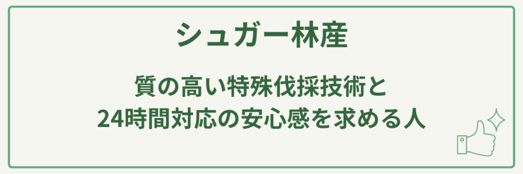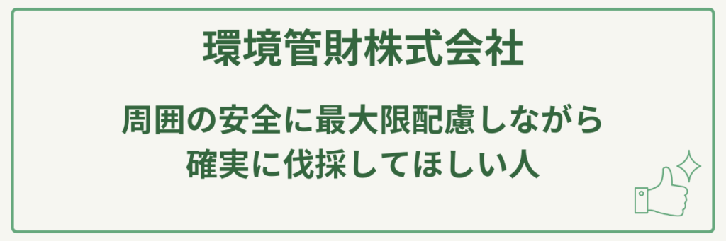 そのため、「福島県内および近隣エリアで、緊急性の高い危険な大木の伐採や支障木処理をプロに任せたい人」や「質の高い特殊伐採技術と、24時間対応の安心感を求める人」におすすめの業者です。