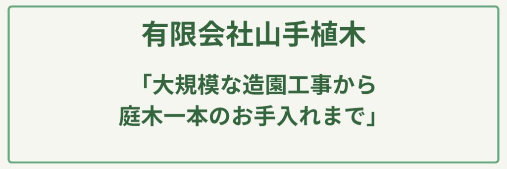 | ポイント | 安心の完全直接施工体制/大規模案件から庭木1本まで対応/土日祝日の施工相談が可能/東京都内全般の広域対応/見積もり・相談無料/マンション緑地管理の実績豊富/ |