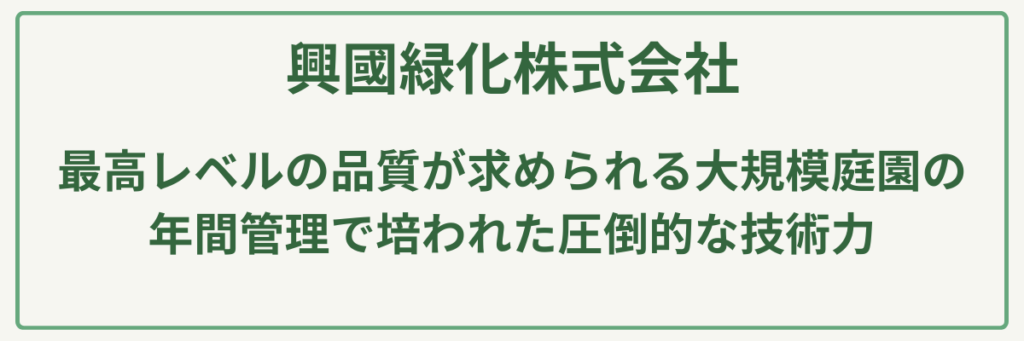 東京都福生市に本社を構える興國緑化株式会社は、創業以来**「誠実さ」を理念に掲げ、官公庁や大手企業の重要施設から個人宅まで幅広く手がける実力派の造園会社です。最大の強みは、最高レベルの品質が求められる大規模庭園の年間管理で培われた圧倒的な技術力にあります。特に「松の手入れ」や「高木の剪定・伐採」**など、高度な熟練技を要する作業において多くの実績を誇ります。