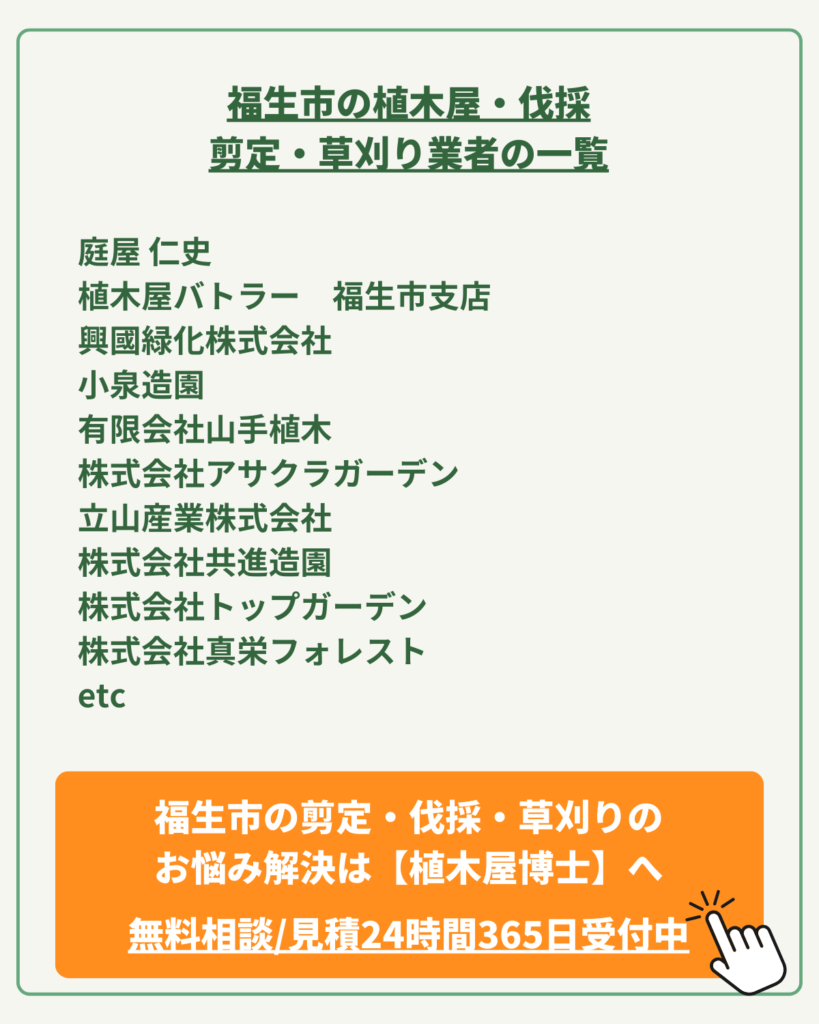 今回は、そんなお悩みを抱えるあなたに向けて、植木屋博士運営が、福生市の植木屋さん達をご紹介します。