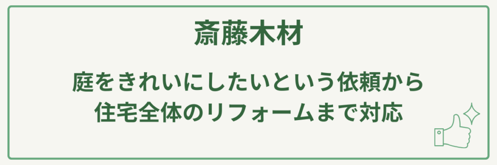 斎藤木材は、材木屋としての知識と、建築業許可に基づいたリフォーム・解体・エクステリア工事の技術を併せ持っていることが最大の強みです。