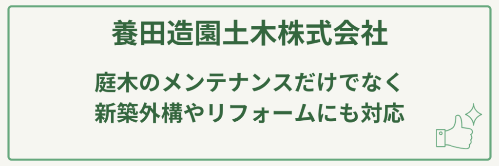 | 対応サービス | 造園、外構・エクステリア工事、新築外構、リフォーム、ガーデニング、庭木のメンテナンス(剪定含む)、石工事など |