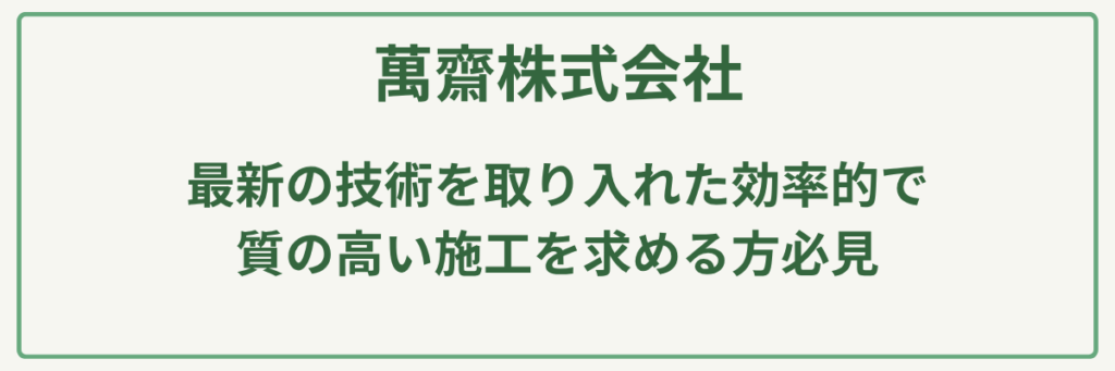 | ポイント | 令和7年度「八戸市卓越技能者」受賞者による確かな施工品質/自社開発の特許技術(コンスライダー)を持つ高い技術開発力/経済産業省の知的財産活用事例集に掲載される信頼の企業体制/土木から造園、舗装までワンストップで対応可能な施工体制/「安全・確か・きれい」を徹底する職人魂/八戸市南郷エリアを拠点に地域密着の迅速な対応 |