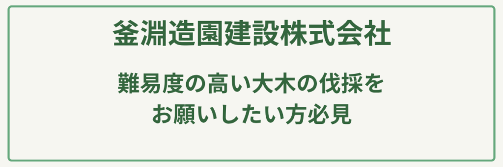 | ポイント | 登録商標「吊し伐り」工法による、難易度の高い特殊伐採の国内トップクラス技術/昭和46年創業の長い歴史に裏打ちされた信頼と実績/造園・林業・建設の三位一体で、自然破壊を最小限に抑える施工を実現/国立公園や景勝地など、極めて高い専門性が求められる現場の管理実績が豊富/「釜渕農園」を通じた苗木生産から植栽まで、 |