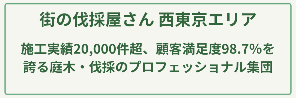 「街の伐採屋さん 西東京エリア」は、羽村市を中心に西東京エリアで活動する、施工実績20,000件超、顧客満足度98.7%を誇る庭木・伐採のプロフェッショナル集団です。最大の強みは、地域密着ならではの「最短30分」という驚異的な駆けつけスピードにあります。急な倒木の危険や、電線に掛かりそうな枝の処理など、緊急を要するトラブルにも即座に対応してくれます。