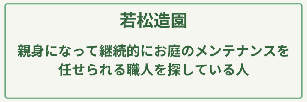 若松造園は、埼玉県飯能市を拠点に、埼玉県西部や東京23区で幅広く活動する植木屋です。「緑豊かな空間を創造し、心地よいくつろぎを提供する」をコンセプトに、庭木の剪定から伐採、草刈り、さらには造園工事まで、庭に関するあらゆる悩みに丁寧に応えています。