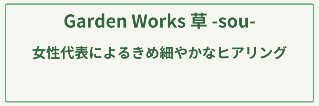 | ポイント | 2008年創業、女性デザイナーによる感性豊かなオーダーメイドの庭づくり/広告・建築業界出身のスタッフによるデザインと機能性が融合したプランニング/DIYのサポートやガーデンレッスンなど、完成後も「育てる楽しみ」を共有/ツリーデッキやブランコ、自然石を活かした「遊べる庭」の施工実績が豊富/完全予約制による、一軒一軒の要望にじっくり向き合う丁寧なコンサルティング |