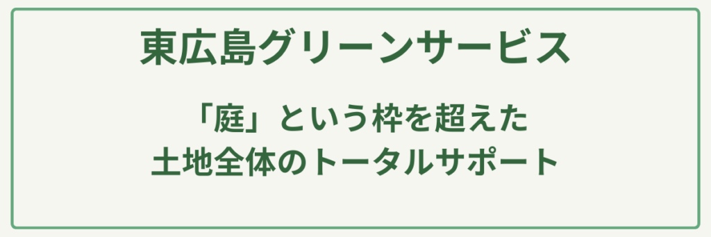 | ポイント | 東広島地区の美観強化店として地域に密着した迅速な対応/荒地整備や土地活用など、不動産価値を高める専門的な助言を提供/和風・洋風それぞれの特性を活かしたこだわりの維持管理とデザイン提案/LINEや公式SNSを通じた気軽な相談窓口と透明性の高い情報発信/環境に配慮した施工(エコフレンドリー)と「想い」を形にする誠実な姿勢 |