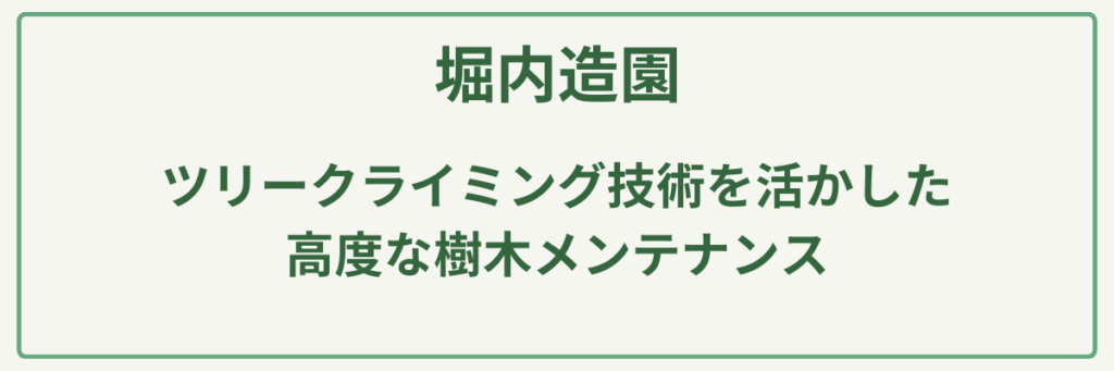| ポイント | 創業1972年、東広島で50年以上の歴史を誇る信頼の造園企業/ツリークライミング技術による「特殊伐採」のスペシャリスト集団/1級造園技能士・1級造園施工管理技士・樹木医などの国家資格保持者が多数在籍/ネットで完結する「オンライン見積り」やLINE相談などDX化による利便性/SDGsへの取り組みや地域への寄せ植え教室開催など社会貢献にも積極的 |