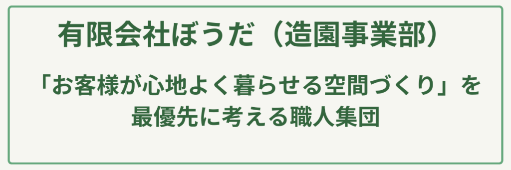 | 対応サービス | 庭木の剪定・伐採・薬剤散布・造園設計施工・エクステリア工事・メンテナンス |