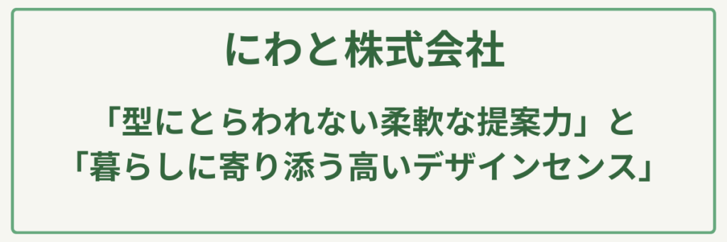 | ポイント | スタッフ全員が若い職人で構成された、業界屈指の機動力と柔軟な提案力/東広島から全国まで幅広く対応可能なフットワークの軽さ/アンティーク資材やウッドフェンスなど、現代的なリフォームの実績が豊富/「春・夏・秋・冬」の心を指針とした、誠実で真心込めた施工品質/1級造園技能士等の有資格者在籍による確かな技術力(※会社概要に基づく) |