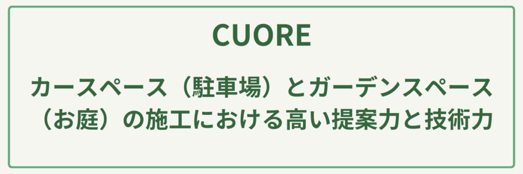 CUORE(クオーレ)は、東京都東大和市に拠点を置き、立川市、武蔵村山市、小平市など多摩地区を中心に活動する外構・エクステリアのスペシャリストです。社名の「CUORE(イタリア語で『心』)」が示す通り、お客様の想いに寄り添い、誠実かつ丁寧な仕事を徹底することで「暮らしをより豊かにする」住まいづくりをサポートしています。
