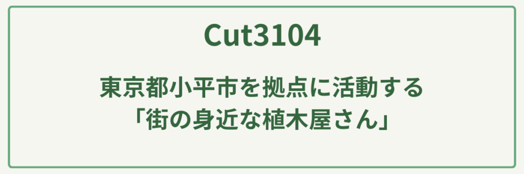 | ポイント | 代表・佐藤氏による、迅速かつ丁寧な「顔の見える」マンツーマン対応/「Cut3104」の名にふさわしい、庭木を美しく整える剪定技術/スポーツ事業も展開する活動的で爽やかな社風と地域貢献への意欲/小平市を中心とした地域密着のフットワークの軽さ/個人邸の小さなお悩みから、造園全般まで柔軟に相談可能 |