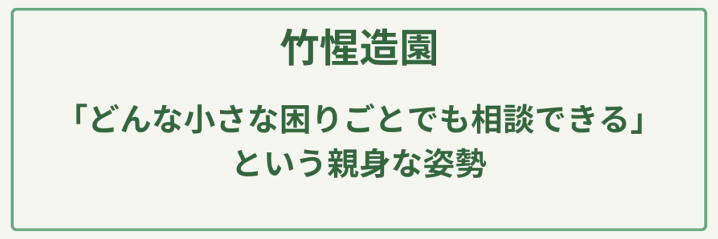 | ポイント | 「デザイン×機能」の追求による、暮らしを豊かにするオーダーメイド空間の提案/1級エクステリアプランナーによる、専門知識に基づいた安全で高品質な設計/丁寧な現地調査とヒアリングから生まれる、お客様一人ひとりに合わせた「最適解」/植木の1年間枯れ木補償など、完工後も安心が続く手厚いアフターフォロー制度/オンラインショップやキャンペーンの実施など、お庭づくりをより身近にする多様な活動 |