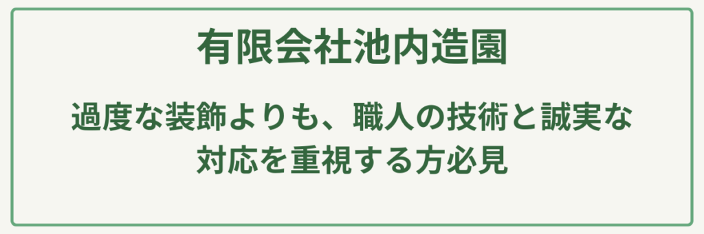 池内造園は、神奈川県大和市を拠点に創業から長年にわたり地域の緑を守り続けてきた、質実剛健な仕事ぶりが評判の植木屋です。最大の強みは、代表自らが現場に立ち、**樹木一本一本の性質を見極めた「透かし剪定」など、木の健康と将来の姿を第一に考えた丁寧な手仕事にあります。そのため、「庭木を無理に短く切るのではなく、自然な樹形を保ちながら美しく整えてほしい」という方や、「顔の見える地元の職人に、長く大切にお庭の管理を任せたい」**という方に最もおすすめの植木屋です。