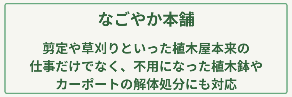なごやか本舗は、神奈川県平塚市に密着した**「お庭の困りごとを丸ごと解決する」便利屋スタイルの植木屋です。最大の強みは、剪定や草刈りといった植木屋本来の仕事だけでなく、不用になった植木鉢やカーポートの解体処分、さらには害虫駆除まで一括して依頼できる点にあります。そのため、「庭を綺麗にするついでに、長年放置していたゴミや重い荷物も片付けたい」という方や、「どこに頼めばいいかわからない細かな悩み」**を抱えている方に最もおすすめです。
