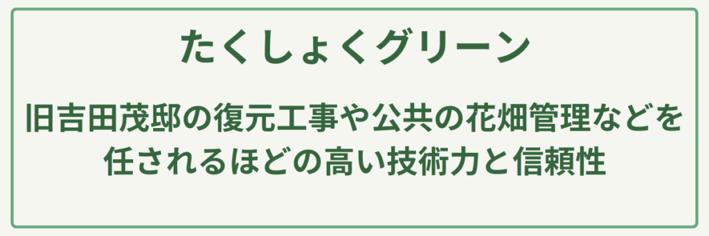 たくしょくグリーンは、神奈川県平塚市を拠点に、公共公園の整備から個人宅のエクステリアまで幅広く手掛ける造園のプロフェッショナルです。最大の強みは、旧吉田茂邸の復元工事や公共の花畑管理などを任されるほどの高い技術力と信頼性にあります。そのため、**「地域のランドマークを手掛けるような確かな実績を持つ業者に、大切なお庭を任せたい」という方や、「植物のプロとしての視点を取り入れた、緑豊かな外構デザインを実現したい」**という方に最もおすすめの植木屋です。