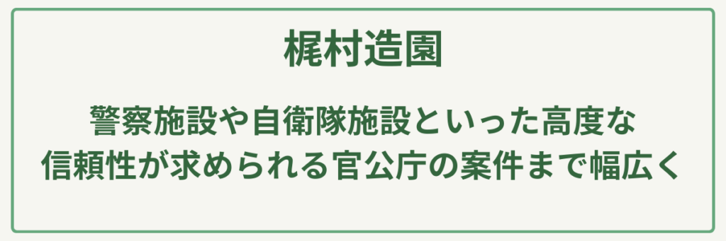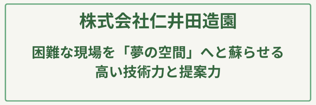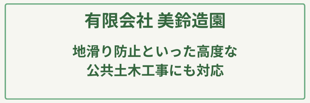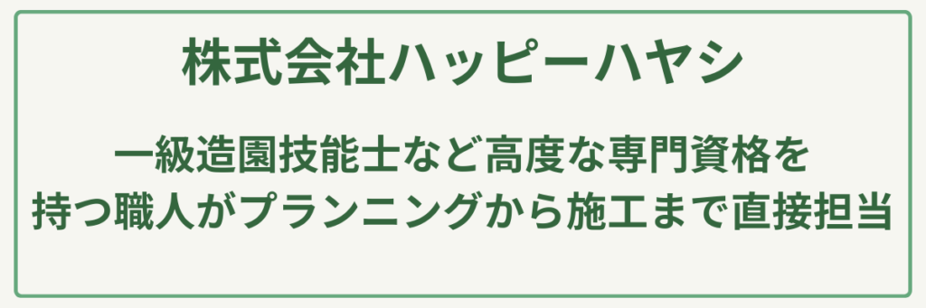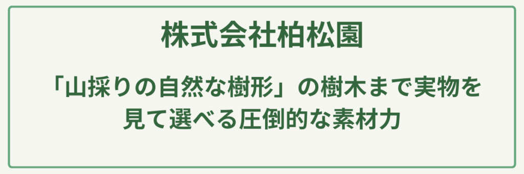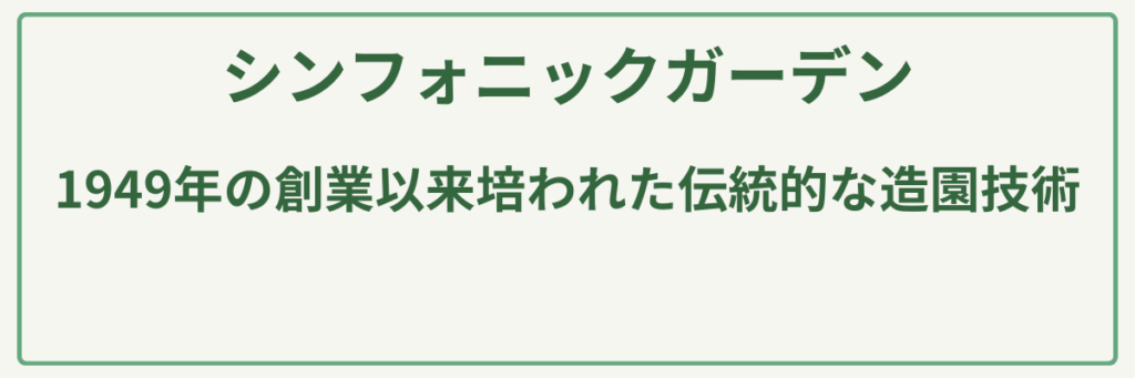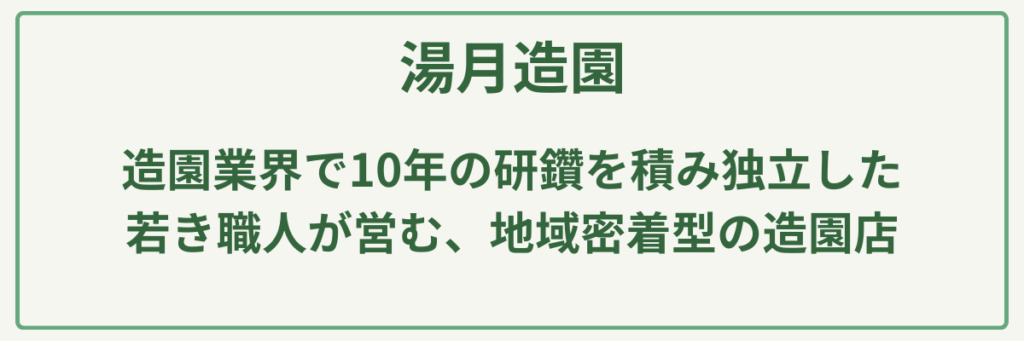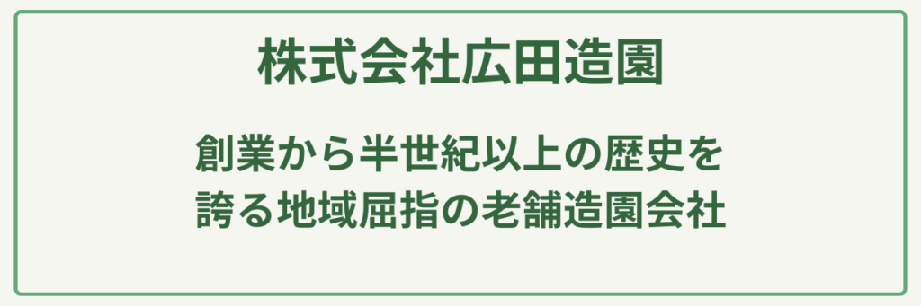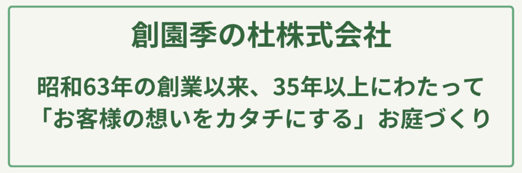 ポイント明治元年創業の圧倒的な歴史と実績/建設業許可(土木・造園・舗装・石・とび土工)取得済み/苗木生産から始まった植物のスペシャリスト/大型駐車場20台完備の店舗併設型/公共工事も手掛ける高い施工管理能力/日本造園建設業協会等に所属する信頼の経営