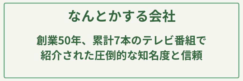 広島市中区に本社を置く「なんとかする会社」は、**「創業50年、累計7本のテレビ番組で紹介された圧倒的な知名度と信頼」を誇る、広島を代表する便利屋の草分け的存在です。その名の通り、庭木の草刈りやハチの巣駆除といった日常のお困りごとから、遺品整理、ゴミ屋敷の清掃、さらには冠婚葬祭の代理出席や悩み相談まで、法律に触れない限り「どんなことでもなんとかする」**という驚異的なサービス範囲が最大の強みです。