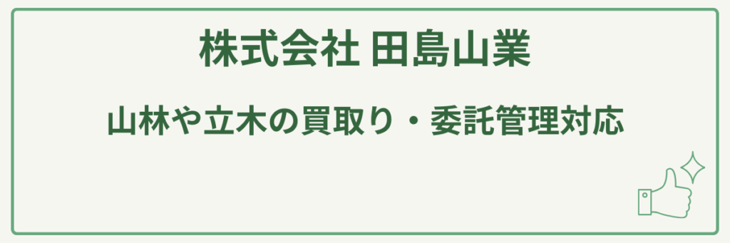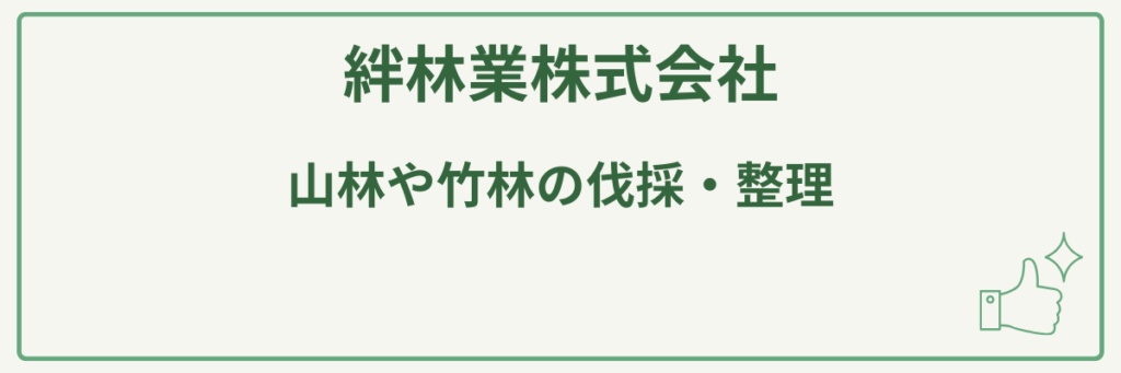 | 対応サービス | 山林・立木の売買、素材生産業(伐採、造材、搬出)、解体工事、産業廃棄物収集運搬業、植林、造林事業 |
