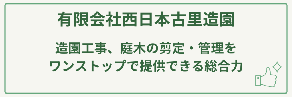 有限会社西日本古里造園は、お客様と誠心誠意向き合う姿勢と、エクステリア、外構工事、造園工事、庭木の剪定・管理をワンストップで提供できる総合力が最大の強みです。