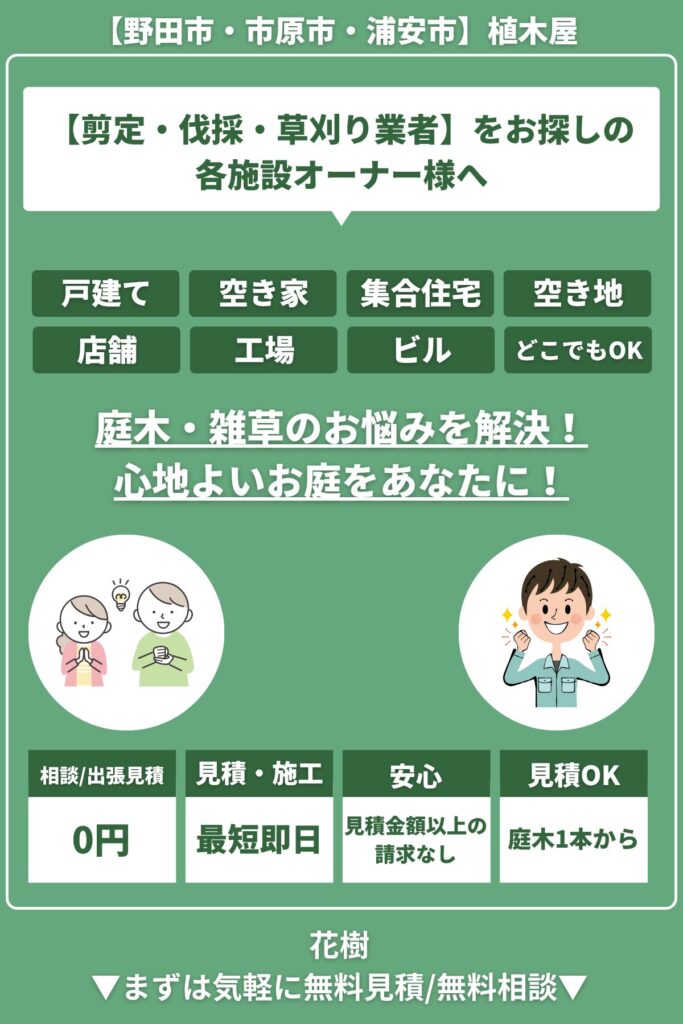 市原市・野田市・浦安市など神奈川県全域を中心に営業されている、地域密着型の植木屋さんです。