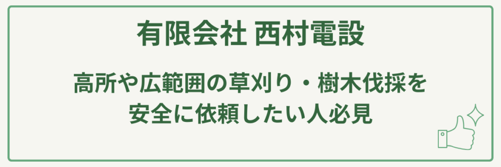 長野県飯田市を拠点とする「有限会社 西村電設」は、水力発電設備の保守点検事業で培った経験と技術を活かし、飯田下伊那地域の草刈り・樹木伐採を代行する会社です。