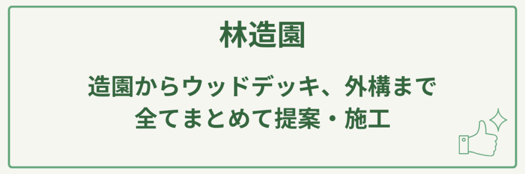 | 対応サービス | 庭木剪定、庭の手入れ、庭造り提案(日本庭園、洋風庭園、ガーデニング)、芝生施工管理・除草・害虫駆除、伐採、造園工事、土木工事一式、バルコニーガーデン、ウッドデッキ、エクステリア工事、外構工事 |