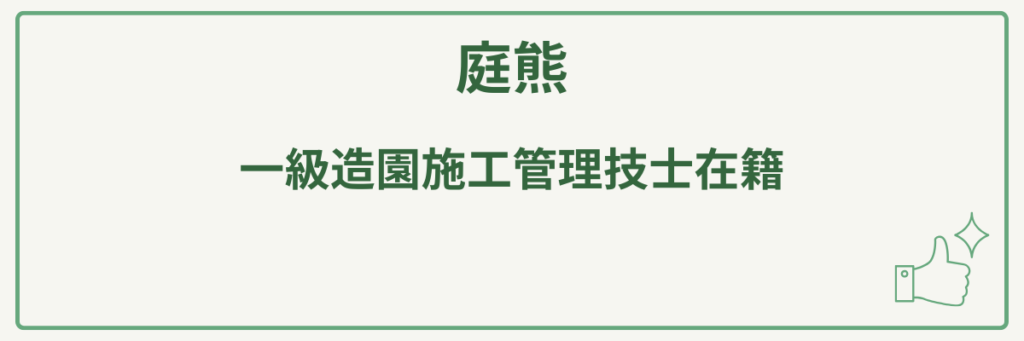 | ポイント | 無料見積・無料相談・庭木1本からでもOK 1級土木施工管理技士 2級造園施工管理技士 2級造園技能士 |